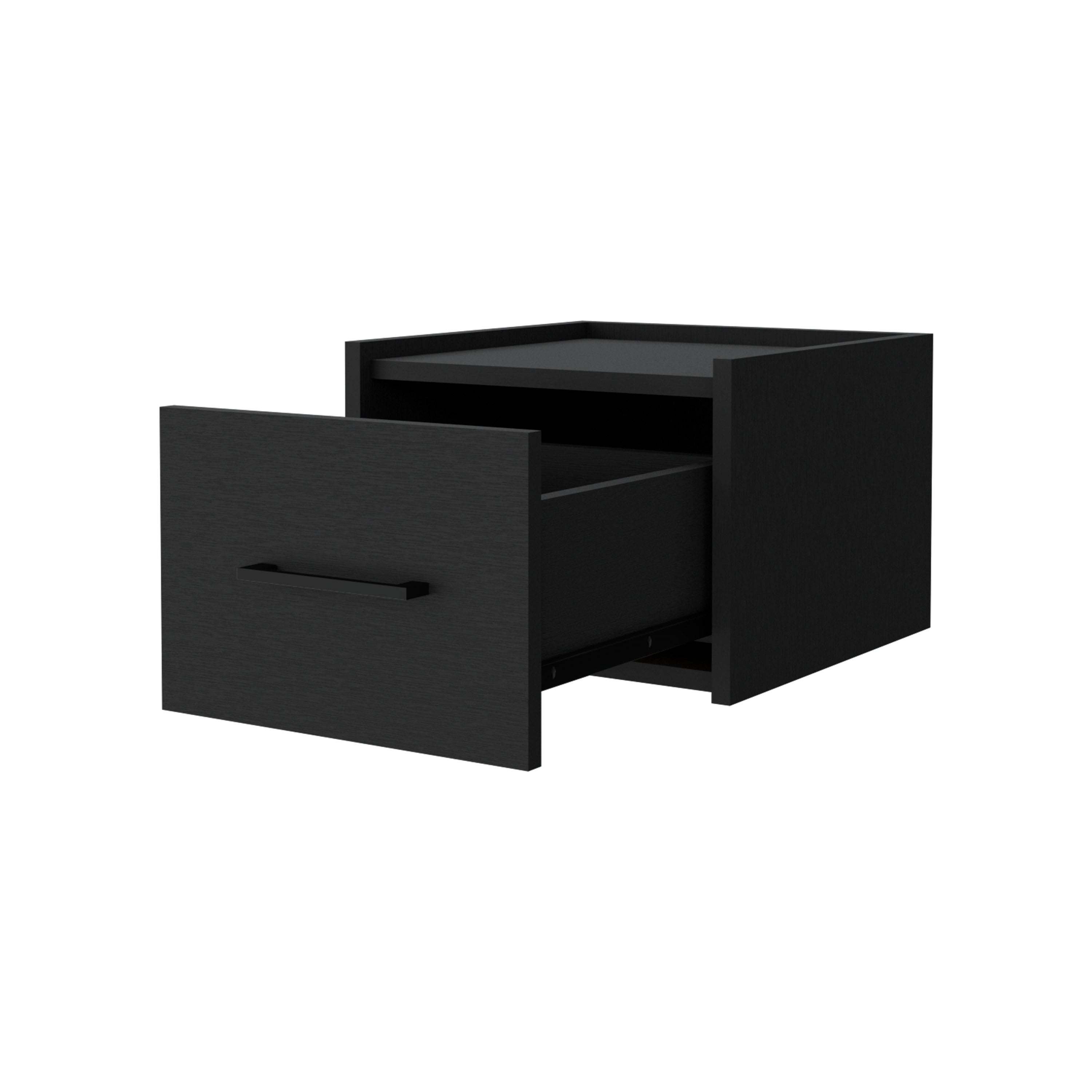 Romance CopyElevate your bedroom ambiance with the floating nightstand, designed to maximize space with its wall-mounted construction, featuring a streamlined single drawer for essentials and a generous top shelf for display. Whether it's your favorite book, a charging station, or decor, the spacious top surface stands ready to accommodate.Product DetailsSet includesOne (1) floating nightstandDimensions9.8 inches high x 13.8 inches wide x 13.2 inches deepFinish colorBlackNumber of drawers1