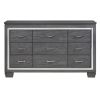 Description & DimensionsGlamour reigns in the design of the Allura Collection. Framing the dresser is a decorative beveled mirror accent that enhances the illumination from the under-light of the nightstand. High polished crystal-enhanced hardware boldly accents the gray finish .PRODUCT DIMENSIONS:Overall Dimension: 64" x 17" x 39.25"HDrawer interior: 21.5" x 12.99" x 5.5" (3); 13.66" x 12.99" x 5.5" (6)Listing Includes: One Dresser Only.Mirror: Not Included.